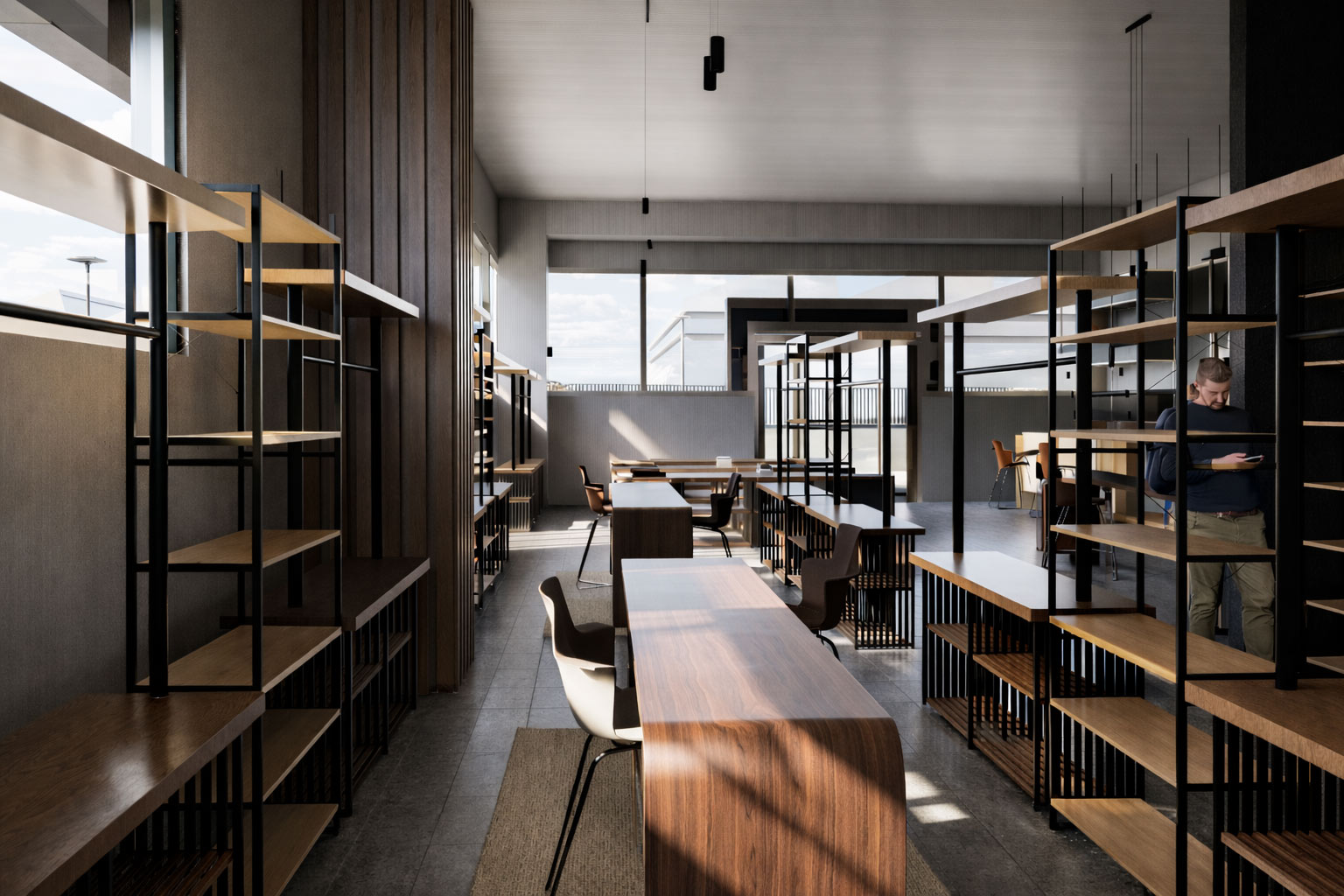 Un collegamento interno al secondo livello mette in relazione i due edifici, separando i flussi della clientela da quelli operativi e garantendo continuità funzionale tra le diverse parti del complesso.