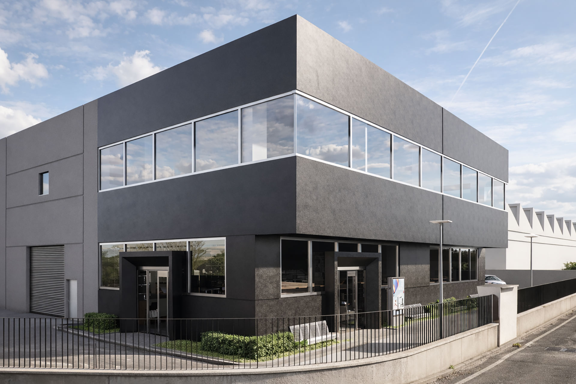 Le ampie superfici vetrate del volume frontale permettono alla luce naturale di permeare gli ambienti di lavoro, contribuendo al comfort interno e restituendo verso l’esterno un’immagine architettonica contemporanea e rappresentativa, coerente con la vocazione commerciale dell’attività.